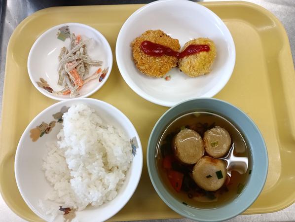 ご飯、コロッケ、ごぼうサラダ、麩のすまし汁