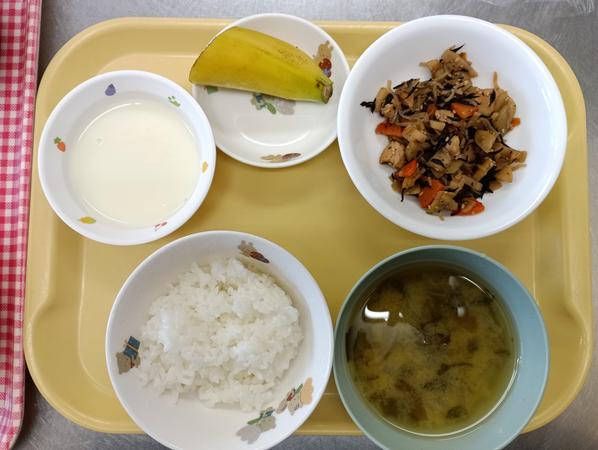 ご飯、栄養きんぴら、みそ汁、バナナ、ヨーグルト