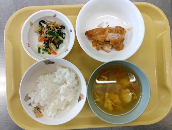 ご飯、タンドリーチキン、じゃこナムル、卵スープ