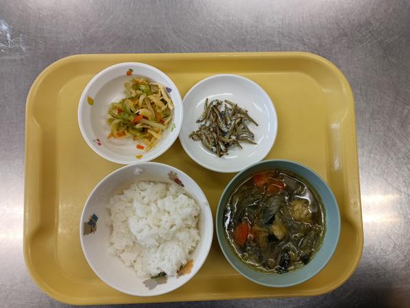 ご飯、肉団子スープ、かみかみサラダ、いりこ